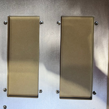The images showcase metal plates, screws, cutouts, and circular hole patterns.